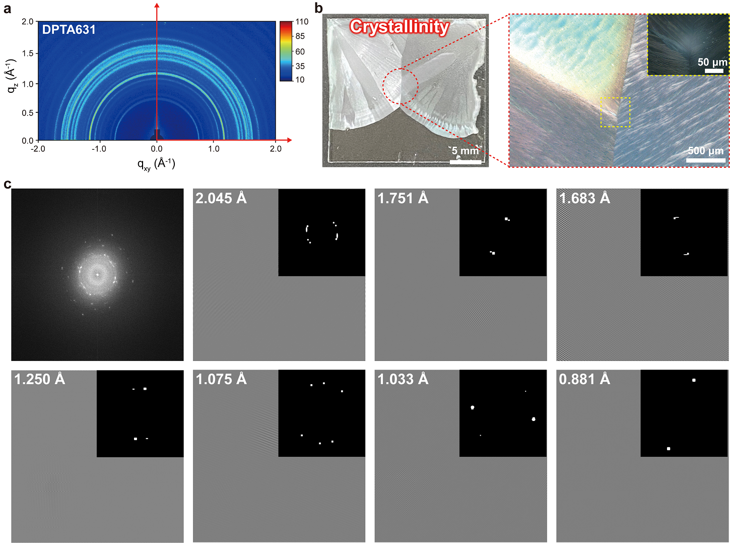 그림 3 개발된 바인더의 결정성 분석 결과 (a) GIXD 이미지, (b) 고분자 바인더가 코팅된 표면 사진 및 편광 현미경(POM) 사진, (c) 선택 영역 전자 회절 이미지. 개발된 바인더의 경우 전도성 그룹의 π-π 결합으로 인해 결정성이 형성 되었으며, GIXD 분석을 통해 35.7 nm의 결정 크기를 확인함. 특히, 무작위 배향성을 나타내어 3차원적으로 효율적인 전자 이동 통로를 제공함.