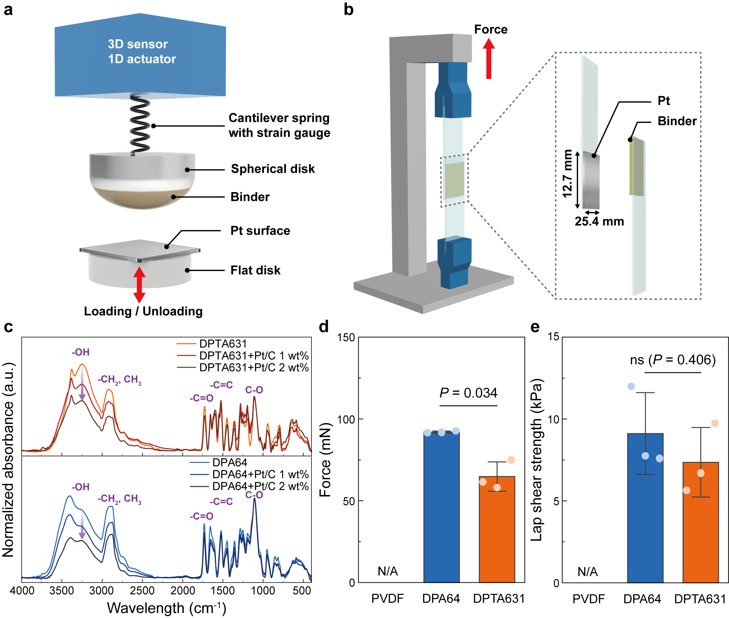 그림 5 개발된 바인더의 접착 메커니즘 및 접착력 측정 결과 (a) 표면 힘 측정 장비 (미세 규모) 및 (b) 전단 강도 실험 (거시적 규모)을 통한 접착력 측정 모식도. (c) 바인더와 촉매의 혼합물 FT-IR 분석 결과. 촉매 증가량에 따라 하이드록실기(-OH)가 감소하는 것을 통해 바인더와 촉매가 금속-배위 결합(Metal-coordination bond) 메커니즘을 확인함. 미세 규모 (d) 및 거시적 규모 (e) 에서 정량적 접착력 측정값과 통계 분석 결과. |