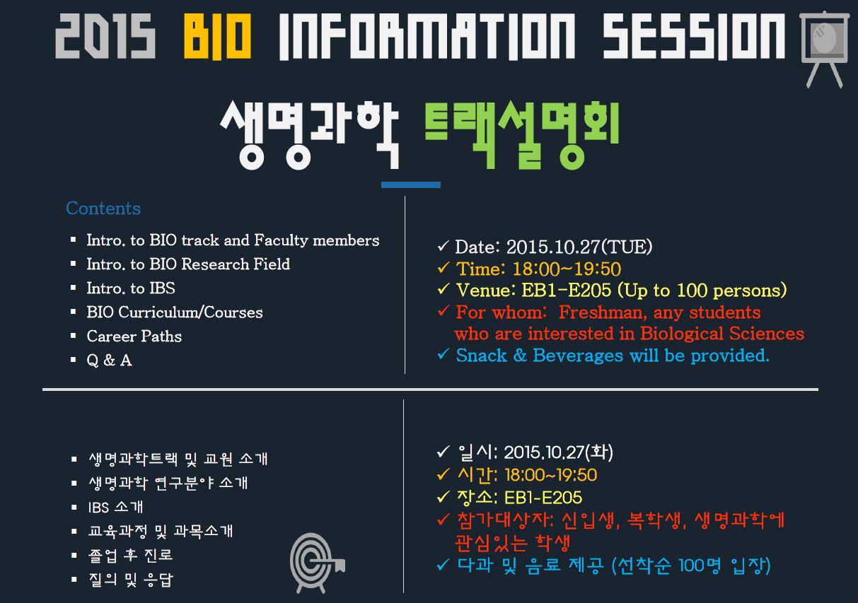 The 2015 BIO Information Session Tuesday, October 27, 2015 6pm~7:50pm Place : EB1-E205 Participant : UNIST Students Department : Administration Center 2 Staff : Ae Gyeong Kang Contact : 052-217-3606 E-mail : aekang@unist.ac.kr calendar facebook twitter google plus email Previous Post SLS Colloquium by Dr. Deok-Soo Kim (School of Mechanical Engineering, Hanyang Univ.) Next Post The 2015 English Commons Halloween Haunted House