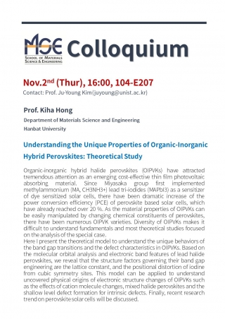 For the lecture, Professor Kiha Hong from Hanbat University, will be presenting “Understanding the Unique Properties of Organic-Inorganic Hybrid Perovskites: Theoretical Study.”