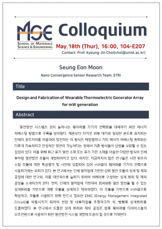 The 8th lecturer of MSE Colloquium is Dr. Seung Eon Moon from ETRI, presenting “Design and Fabrication of Wearable Thermoelectric Generator Array for mW generation.”