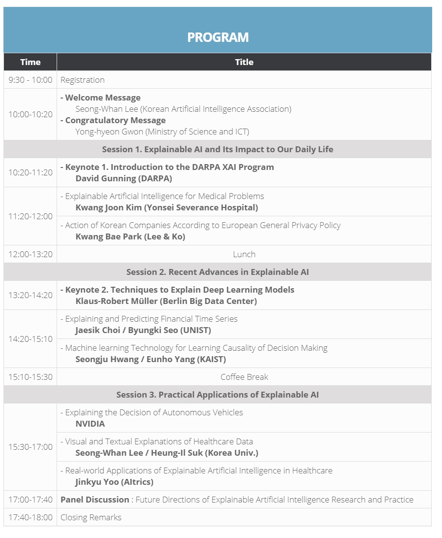 Sponsored by the Korean Government and the Ministry of Science and ICT, the symposium invites top researchers and research organizations that are actively working on XAI problems. The event will feature a various keynote speeches by top-tier AI experts, such as Prof. Klaus-Robert Müller (Director, Berlin Big Data Center) and Dr. David Gunning(Manager, the DARPA XAI Program). Korean researchers who are actively working in the explainable AI project will also present their work.