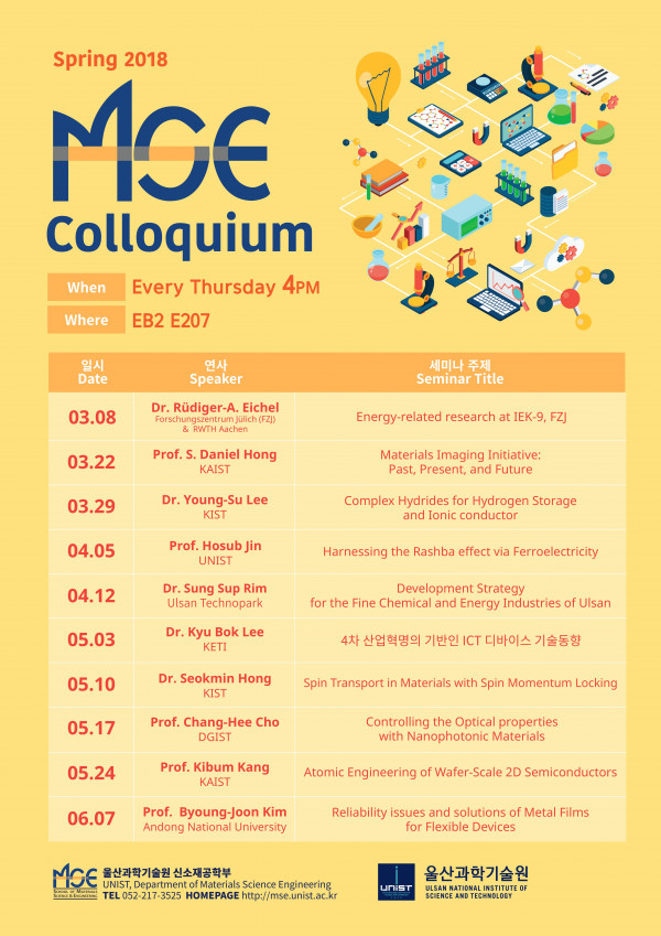 The 2018 MSE colloquium will be held at UNIST, every Thursday from March 8 to June 7, 2018.