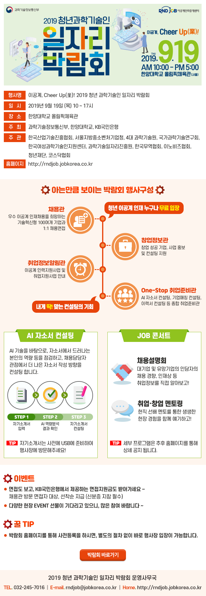 The 2019 Job Fair for Young Researchers is scheduled to be held at Olympic Gymnasium of Hanyang University in Seoul on Thursday, September 19, 2019.