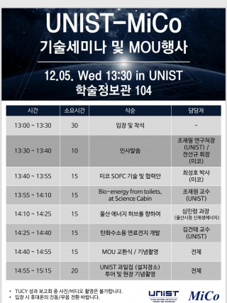 A signing ceremony of the Memorandum of Understanding (MoU) between UNIST and MiCo Co. Ltd. is scheduled to be held on Wednesday, December 05, 2018.