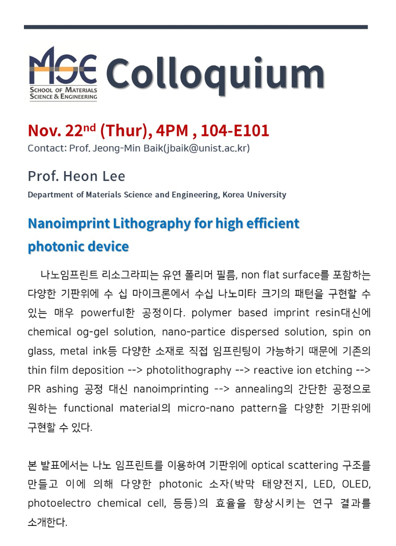 For the lecture, Professor Heon Lee from Korea University will be presenting “Nanoimprint Lithography for High Efficient Photonic Device.”