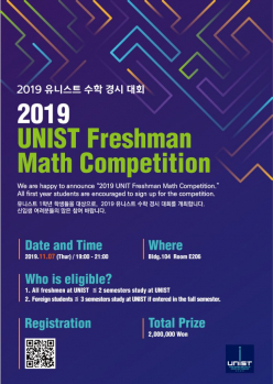 The 2019 UNIST Freshman Math Competition is scheduled to be held on Thursday, November 7, 2019. This event is open to all first year students, including international students ≤ 3 semesters study a..