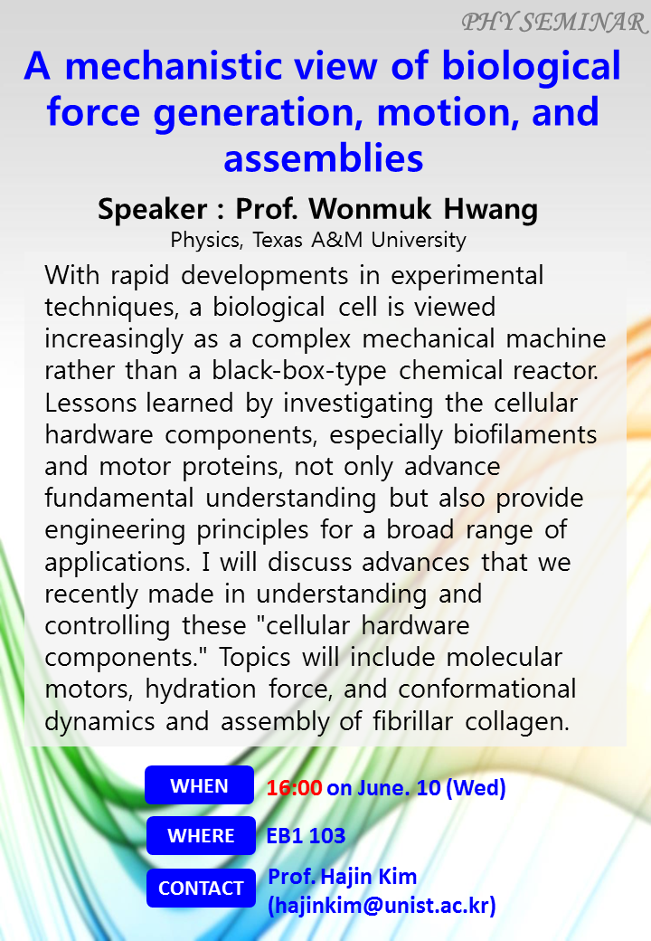 Physics Colloquium Wednesday, June 10, 2015 16:00 Place : EB1 103 Participant : UNIST Students Department : School of Natural Science Staff : Inyoung Yoo Contact : 052-217-3608 E-mail : inyoungyoo@unist.ac.kr calendar facebook twitter google plus email Title: A mechanistic view of biological force generation, motion, and assemblies Previous Post Mathematical Sciences Colloquium Next Post Admissions Seminar for Head Teachers from Science High Schools in Korea
