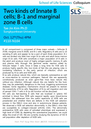 For the lecture, Professor Tae Jin Kim from Sungkyunkwan University will be presenting “Two kinds of Innate B cells; B-1 and marginal zone B cells”