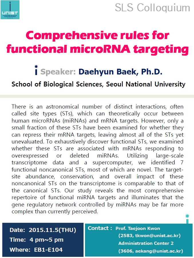 SLS Colloquium by Dr. Daehyun Baek (School of Biological Sciences, SNU)