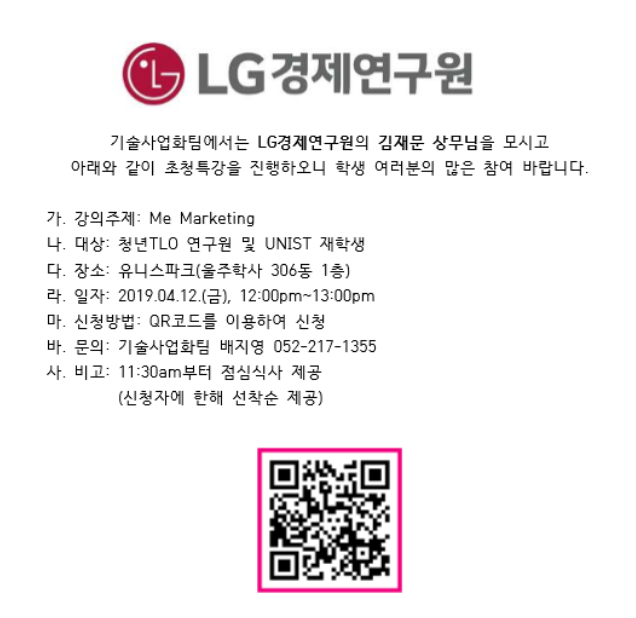 UNIST IP Management & Commercialization Team will be holding a special lecture from 12 to 1pm at a lobby on the first floor of UNISPARK(306). This lecture will be delivered by Director JaeMoon Kim from LG Management Development Institute, under the topic of “Me Marketing”.