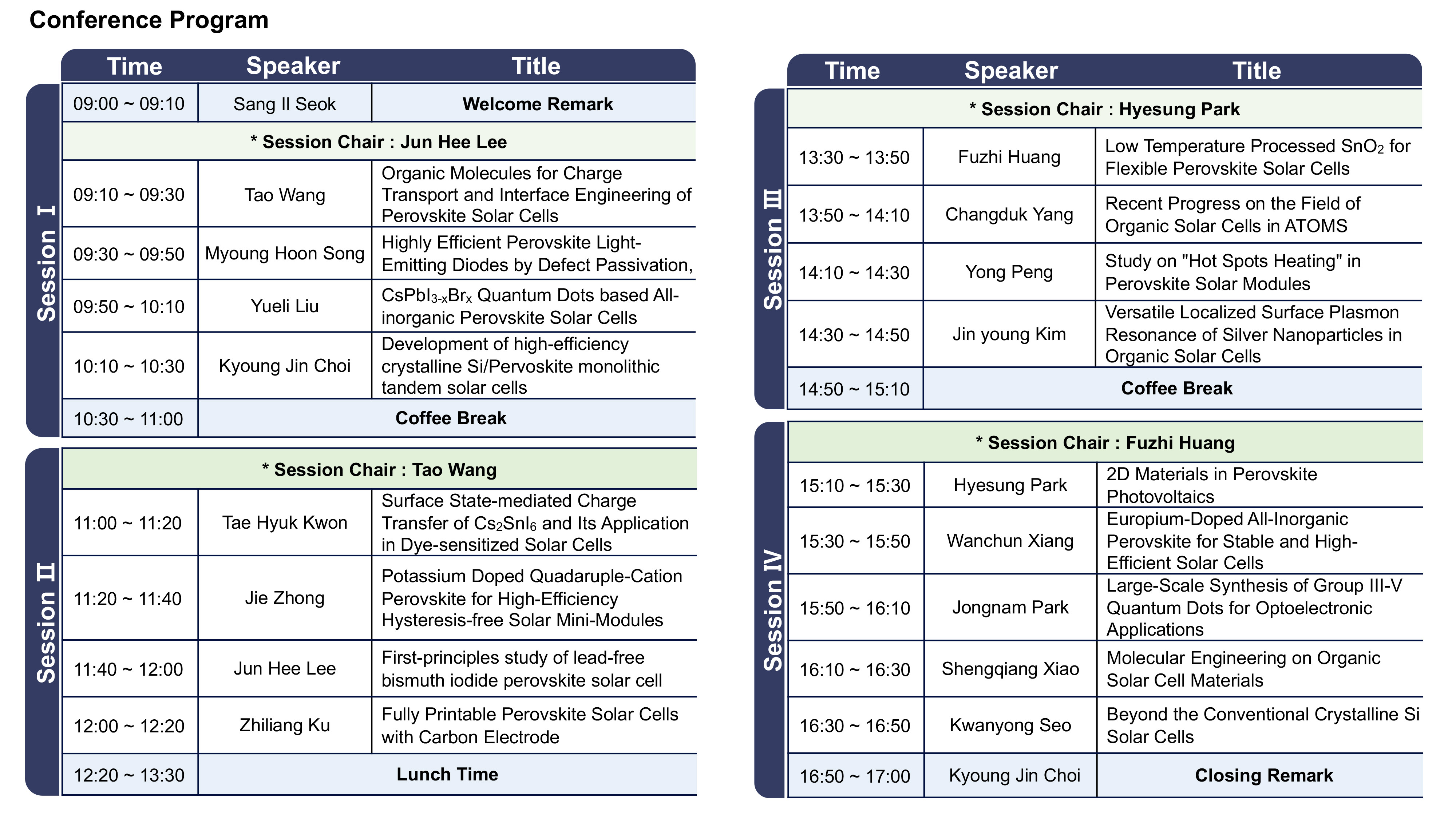 This conference is devoted to sharing the up-to-date scientific achievements and widening academic collaboration between world top-class scientists, with focus on the fundamental characterizations of perovskite materials and applications to various devices such as solar cells, LEDs and electronic devices.