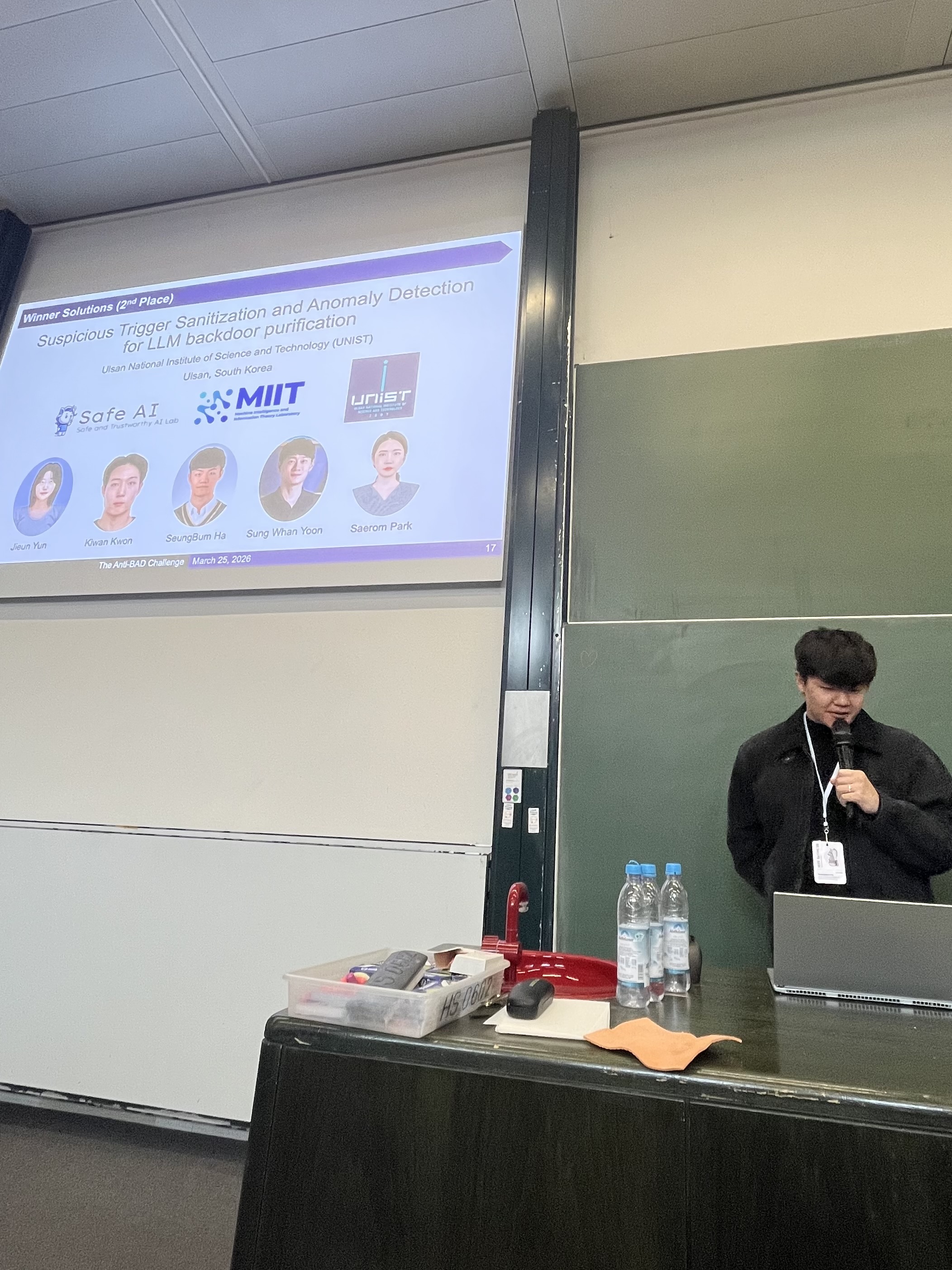 산업공학과·인공지능대학원 박새롬 교수와 인공지능대학원·전기전자공학과 윤성환 교수 공동 연구팀은 지난 23일부터 25일까지 독일 뮌헨에서 열린 국제전기전자공학회(IEEE) 보안·신뢰 기계학습 학회(Security and Trustworthy Machine Learning, SaTML)의 ‘사후학습 대규모 언어모델 백도어 방어 챌린지(Anti-Backdoor Challenge for Post-Trained Large Language Models, Anti-BAD)’에서 2위를 차지했다. 연구팀은 생성, 분류, 다국어 등 서로 다른 과제에 두루 적용할 수 있는 범용 공격 완화 기법을 제시해 호평을 받았다.