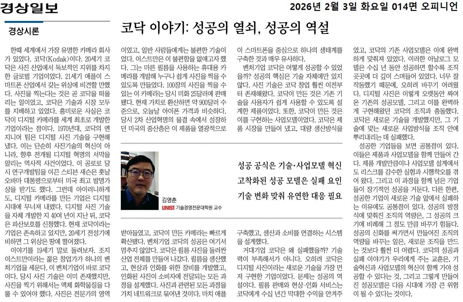 <본 칼럼은 2026년 2월 3일 경상일보 “[경상시론]코닥 이야기: 성공의 열쇠, 성공의 역설”이라는 제목으로 실린 것입니다.>