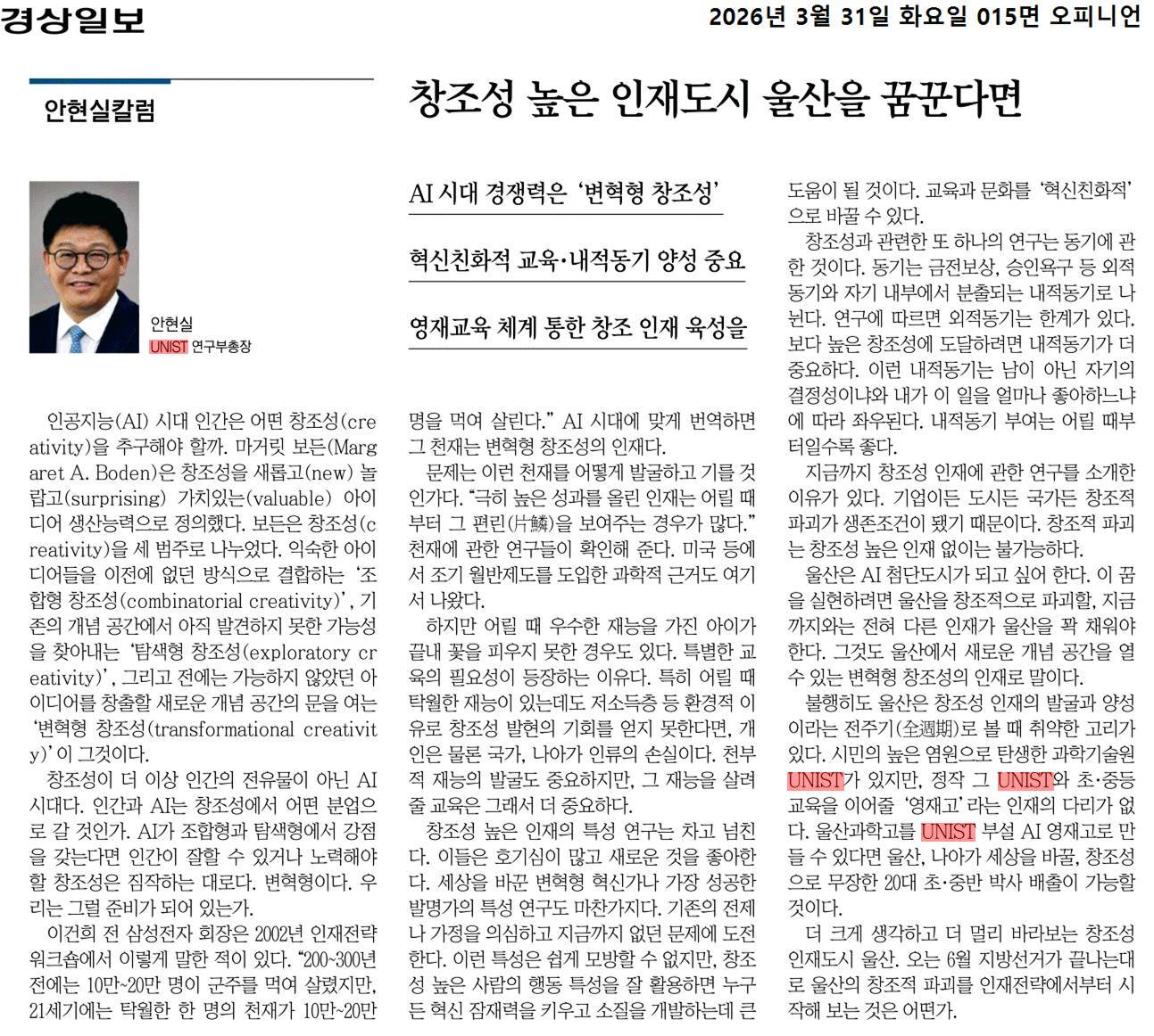 <본 칼럼은 2026년 3월 31일 경상일보 “[안현실칼럼]창조성 높은 인재도시 울산을 꿈꾼다면”라는 제목으로 실린 것입니다.>