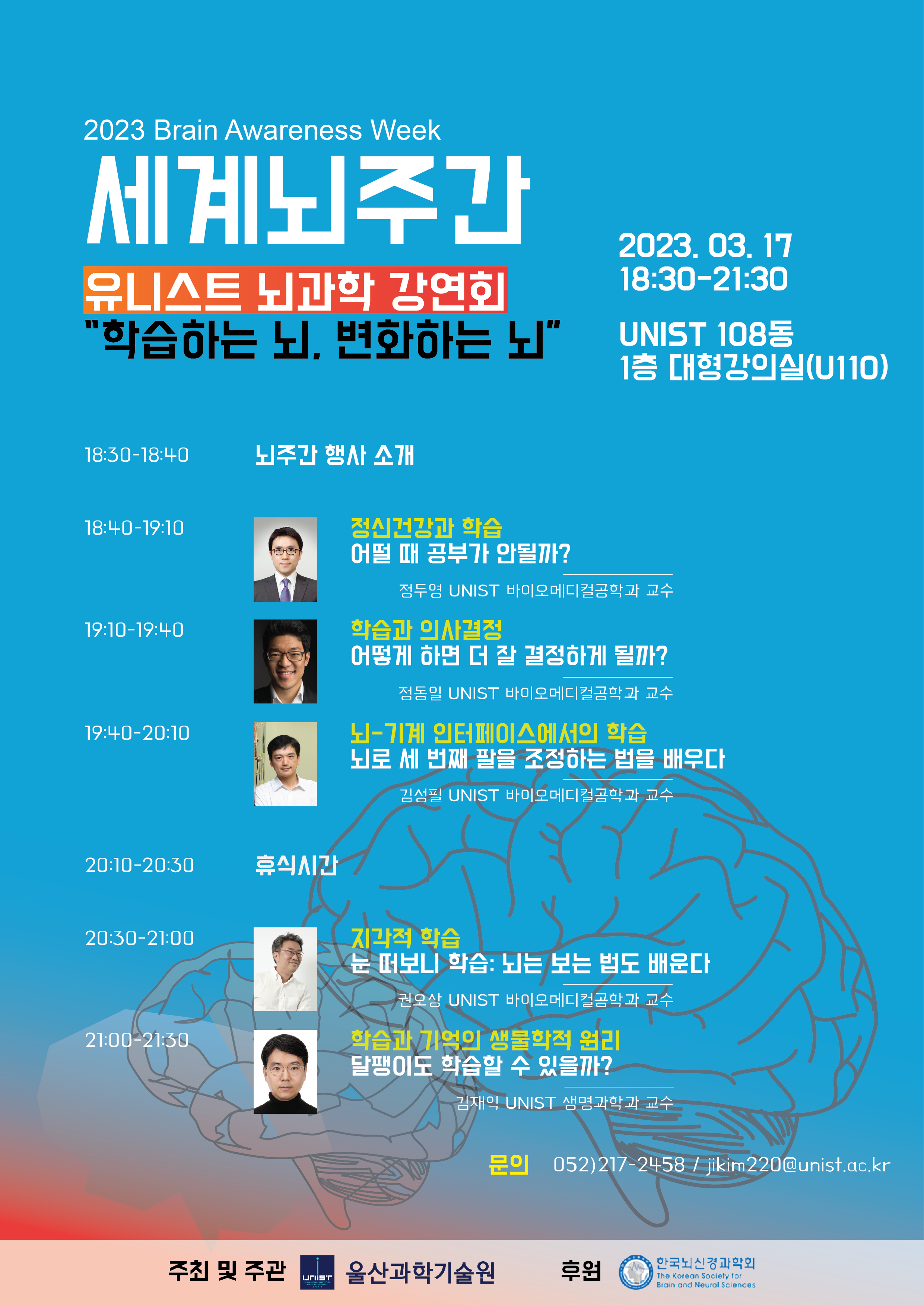 이번 UNIST 뇌과학 강연회의 주제는 ‘뇌가 세상에 대해 어떻게 배우고 발전하는지’에 대한 궁금증에서 시작됐다. 이런 궁금증을 국내외에서 활약하고 있는 UNIST 뇌과학 전공 교수들이 최신 연구 사례들을 중심으로 쉽고 재미있게 풀어 설명할 예정이다. 특히 이번 강연에서는 달팽이와 같은 동물의 뇌가 어떻게 학습하는지에 대한 생물학적 원리부터, 인간의 뇌가 세상을 보는 법, 신체를 움직이고 결정을 내리며 공부하는 방법까지 다양한 배움의 원리가 다뤄지게 된다.