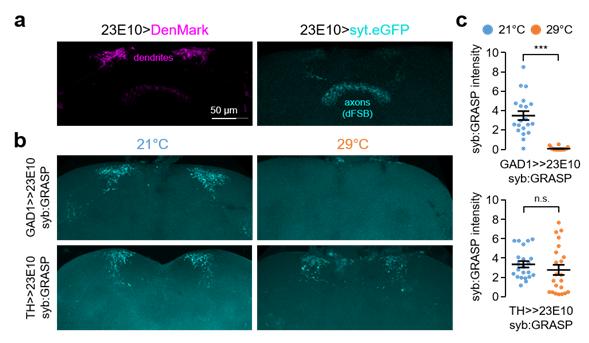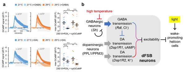 또 살아있는 초파리 뇌의 칼슘 이온(Ca²⁺) 이미징 기법을 이용해 ‘수면촉진 신경세포(dFSB)를 조절하는 신호가 기온 변화에 따라 달라진다’는 사실도 규명했다. 낮은 기온(21℃)에서 가바가, 높은 기온(29℃)에서는 또 다른 신경전달물질인 도파민(dopamine)이 수면촉진 신경세포(dFSB)의 활성을 제어하는 게 관찰된 것이다.