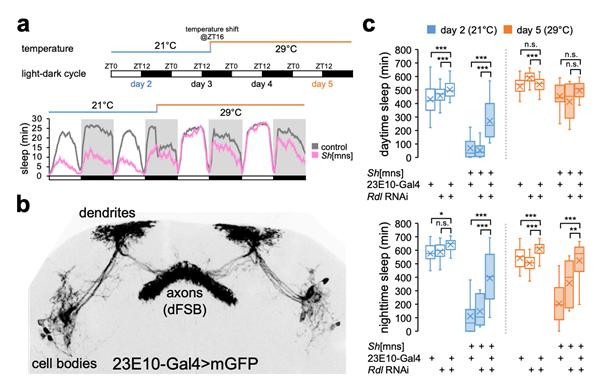 임 교수팀은 이 현상이 ‘수면촉진 신경세포다발(dFSB; dorsal Fan-Shaped Body neuron)’과 억제성 신경전달물질인 ‘가바(GABA)’ 사이의 연결고리가 사라져서임을 밝혔다. 셰이커 유전자 돌연변이는 가바 신호전달 과정을 과도하게 활성화해 수면을 억제한다. 그런데 기온이 높아지면 ‘가바(GABA)를 생산하는 신경세포’와 ‘수면을 촉진하는 신경세포(dFSB)’ 사이의 시냅스가 사라진다. 가바를 전달해서 수면을 억제하기 어려워지므로 더 잘 자게 되는 것이다.