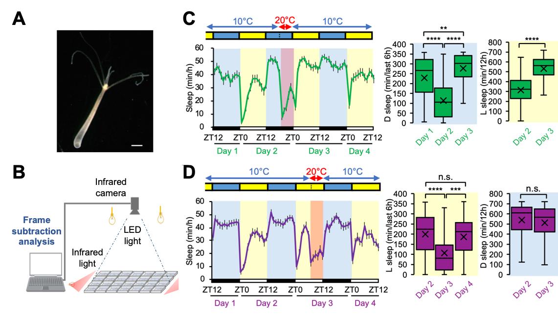 연구진은 히드라가 사람처럼 밤낮을 구분해 잠을 자며, 물리적 자극이나 주변 온도를 높여 수면을 방해하면 역시 사람처럼 수면을 보충하는 행동을 발견했다. 연구진은 히드라의 움직임을 24시간 연속 촬영했을 때 불이 꺼지면 히드라의 움직임이 둔해진 것에서 착안해 이 ‘둔한 움직임’이 사람의 수면에 해당한다는 결론을 얻은 것이다.
