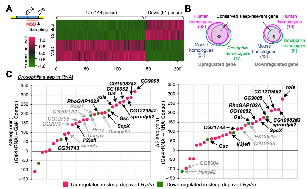 또한 연구진은 히드라의 수면을 조절하는 유전자 찾아내고 이를 다른 생물들과 비교했다. 초파리, 쥐 등에서 수면을 촉진하는 인산화 효소로 알려진 PRKG1 유전자는 히드라의 수면도 촉진했다. 하지만 아미노산의 한 종류인 오르니틴 대사 효소 OAT(ornithine aminotransferase)는 진화된 생물인 초파리와 비교해 정반대의 수면 조절 기능을 보였다. 수면에서 오르니틴 대사와 오르니틴 대사 효소 OAT(ornithine aminotransferase) 역할은 이번에 새롭게 규명됐다.