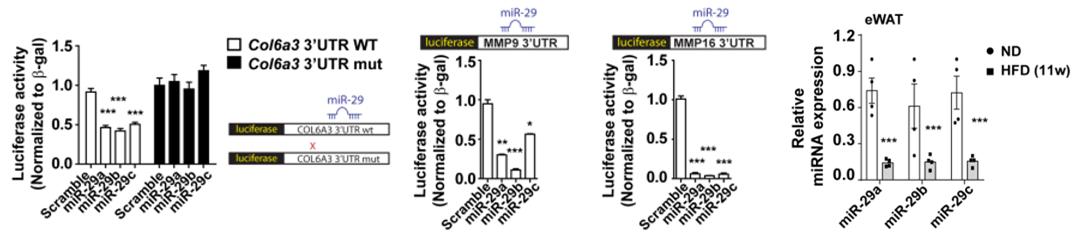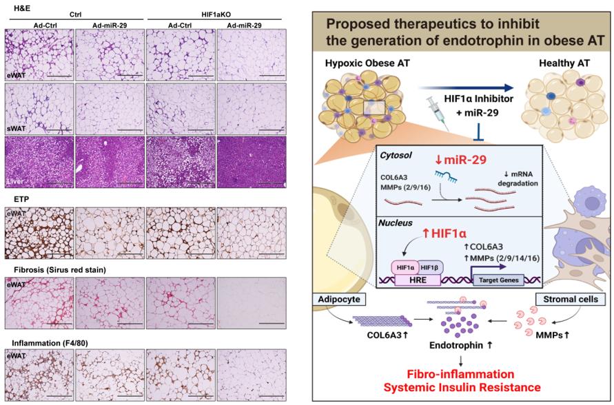 이번 연구에서 박 교수팀은 일반인과 비만인의 지방조직을 대조 분석해 엔도트로핀을 분리해내는 단백 분해 효소(MMPs)를 찾아내고, miRNA-29로 이 단백 분해 효소 합성 자체를 억제할 수 있음을 알아냈다.