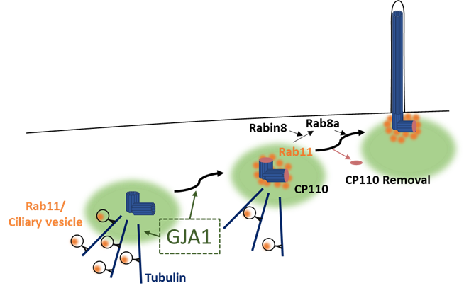 GJA1 단백질의 작용 기전. Rab11 단백질이 모인 뒤 CP110 단백질이 제거되면서 섬모 성장_GJA1은 Rab11이 섬모 기저부로 이동하도록 조절한다.