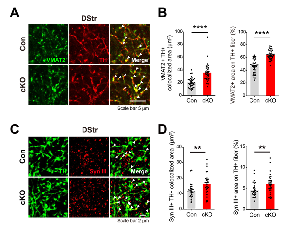 그림2. 도파민 신경세포의 축삭 말단에서 PLCγ1이 결손되었을 때, 도파민 분비를 조절하는 VMAT2, synapsin III의 양이 증가 그림2. 도파민 신경세포의 축삭 말단에서 PLCγ1이 결손되었을 때, 도파민 분비를 조절하는 VMAT2, synapsin III의 양이 증가