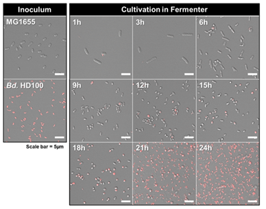 그림2. Scheme D 배양 방식을 적용하여 발효 반응기 내에서 먹이 박테리아인 대장균(E. coli K-12 MG1655)와 포식박테리아(B. bacteriovorus HD100)의 성장을 시간에 따라 현미경으로 보여주는 그림