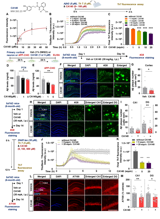 그림1. 도파민 유사체 'CA140'의 아밀로이드 플라크 축적 및 타우 단백질 과인산화 억제 효과