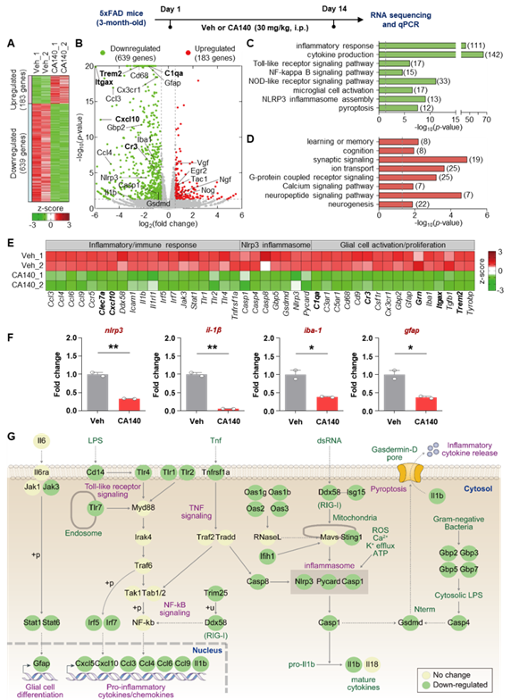 그림2. 알츠하이머병 동물모델에서 CA140을 통한 교세포의 활성 지표 및 뇌 염증 유발인자의 전사체 발현 감소