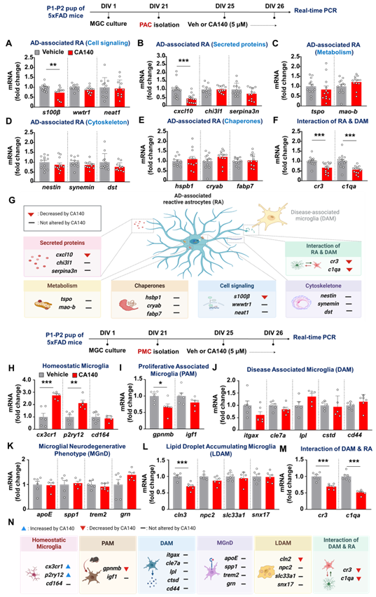 그림3. 알츠하이머병 동물모델 유래 1차 성상세포 및 미세아교세포의 알츠하이머 병증 연관 과활성 지표 감소