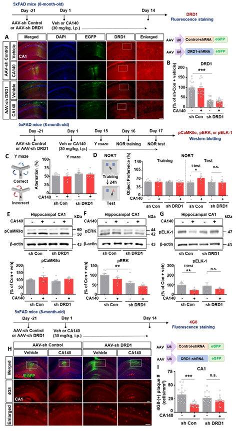 그림4. 도파민 수용체 'DRD1'을 통한 'CA140' 인지기능 및 아밀로이드 병증 조절