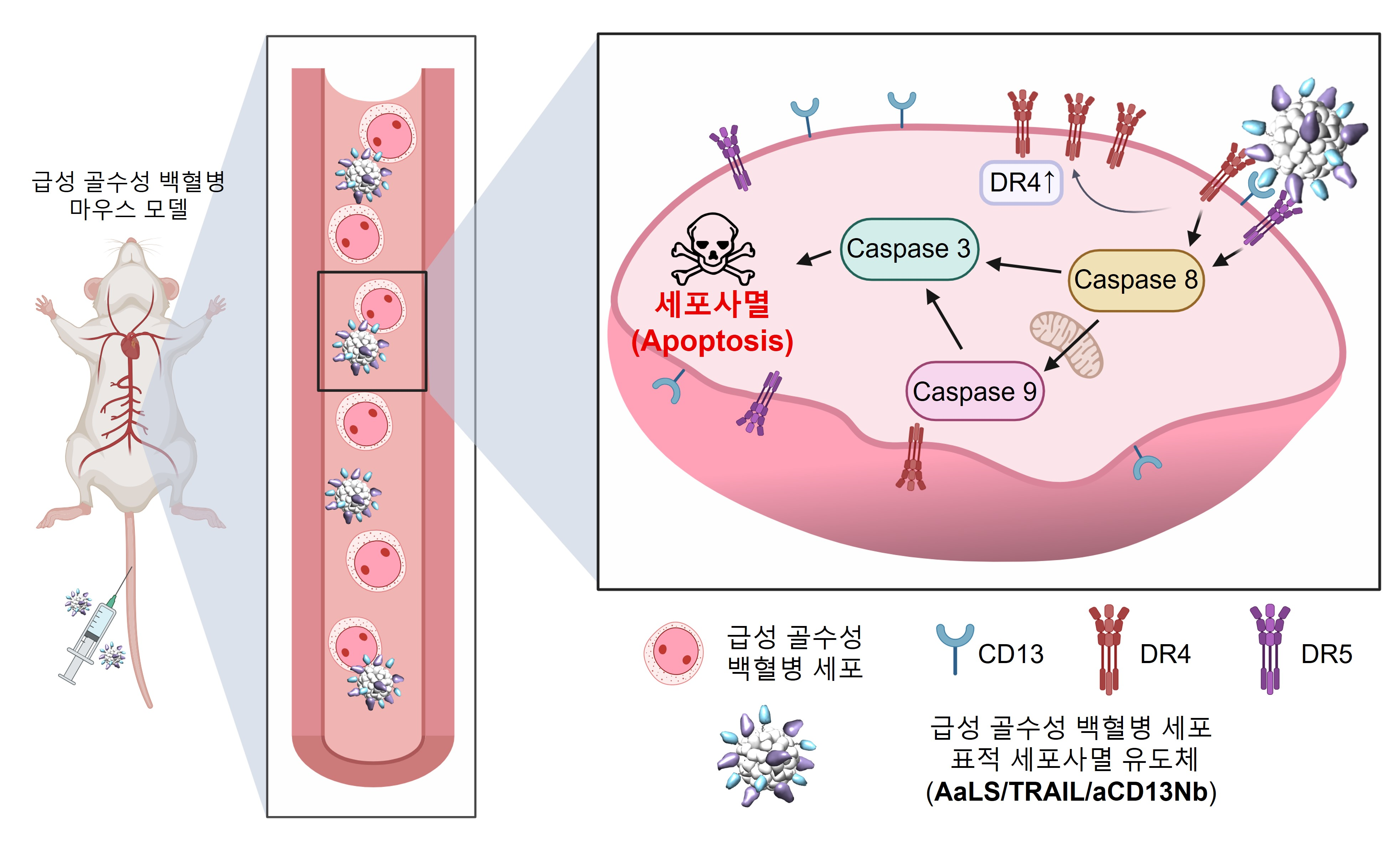 생명과학과 강세병·김은희·박성호 교수 공동 연구팀은 백혈병 암세포만 골라 사멸을 유도하는 단백질 나노입자(AaLS/TRAIL/aCD13Nb)를 만들었다. 동물실험에서 이 나노입자가 백혈병 세포의 성장을 억제하고 마우스의 생존률을 두 배로 늘리는 것을 확인했다.